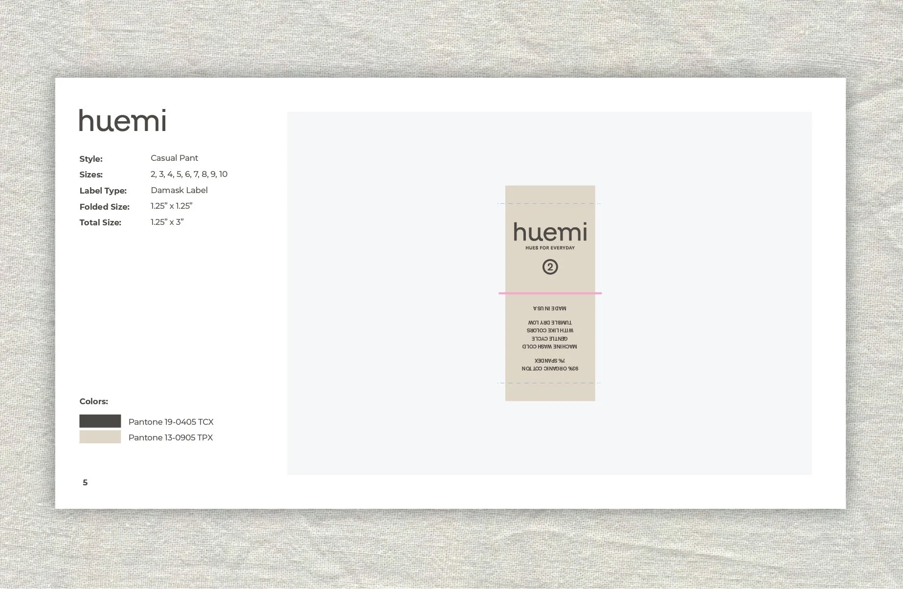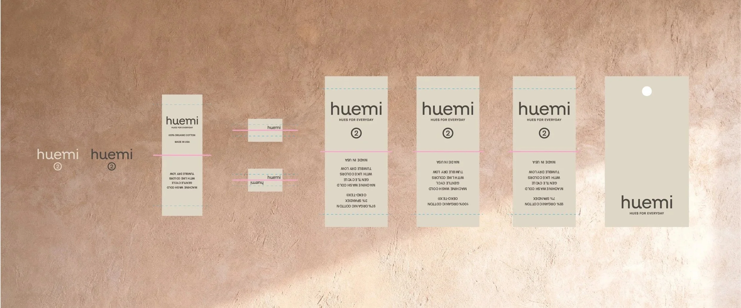 Huemi focused exclusively on woven labels and trims, where typography, spacing, and material choice carry the brand without relying on graphics. The system was designed to feel quiet, premium, and intentional, with careful attention to scale, legibility, and production constraints. Every label and hangtag was built to function consistently across garments while reinforcing a minimal brand presence that feels considered rather than decorative.