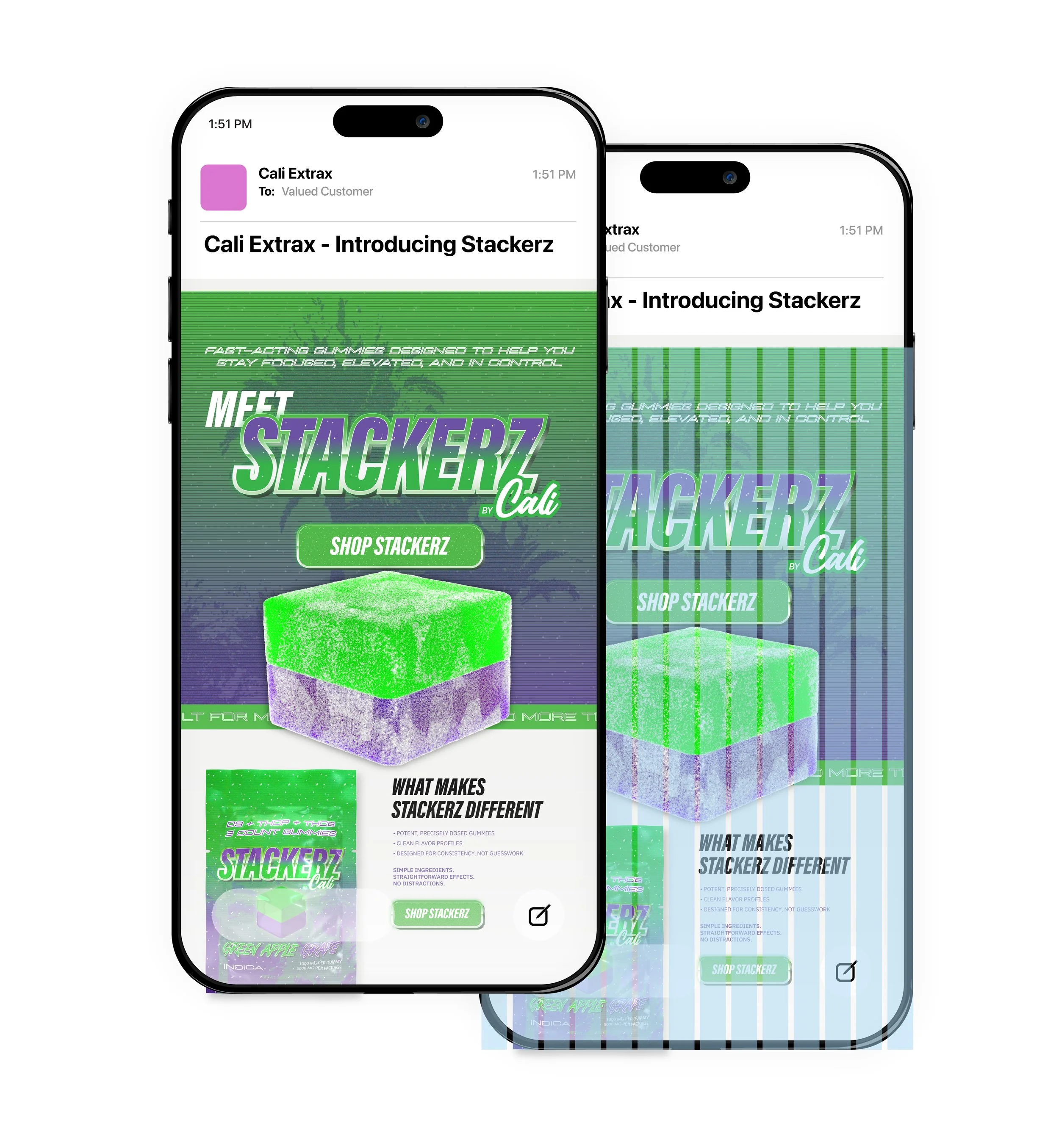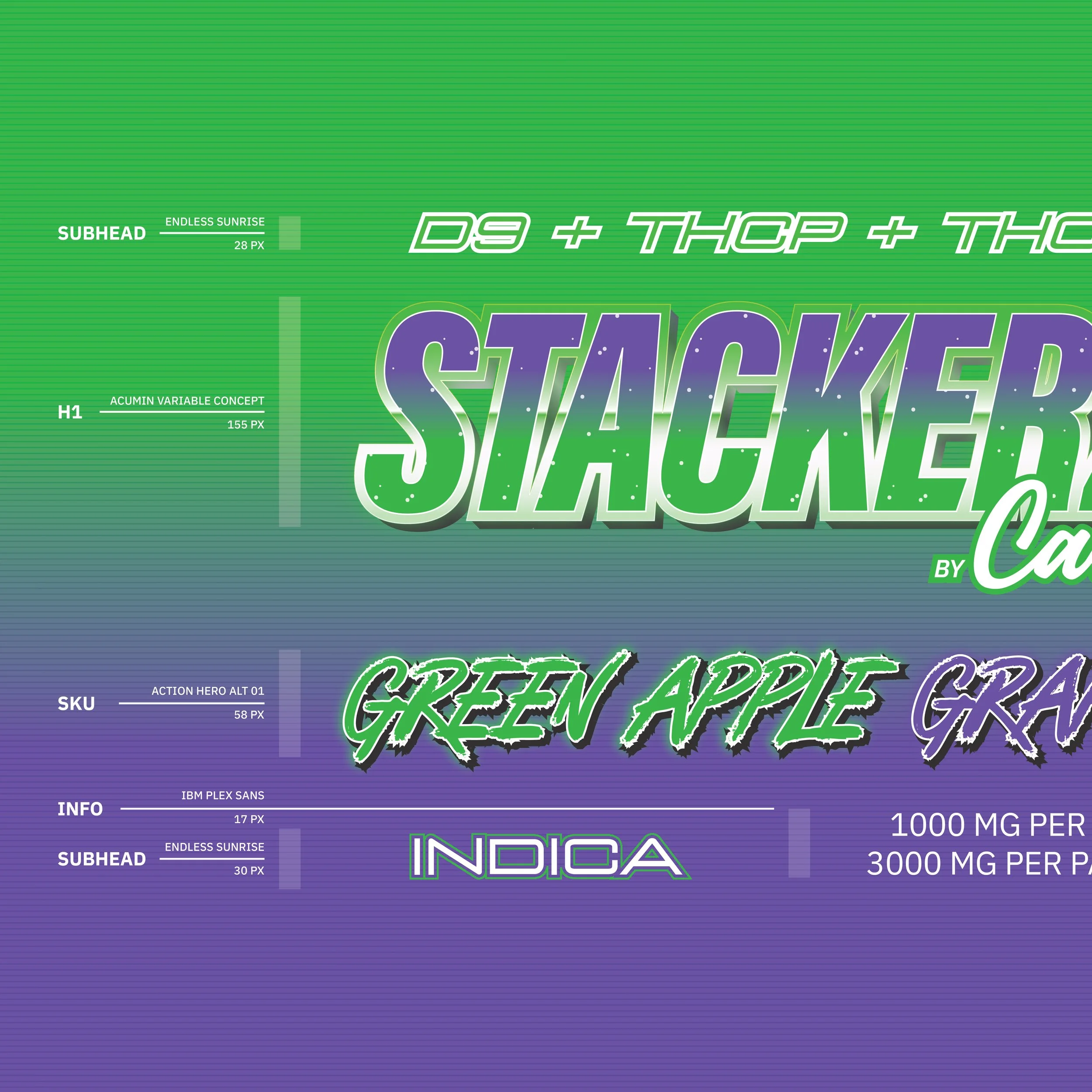 The Stackerz typography system was built to deliver high visual impact while remaining structured and controlled. Condensed, expressive headlines establish immediate presence, while clearly defined subhead and information layers maintain hierarchy across packaging and email marketing. The system balances bold personality with restrained body text to preserve readability within regulatory and layout constraints, allowing the brand to feel energetic without sacrificing usability or consistency.