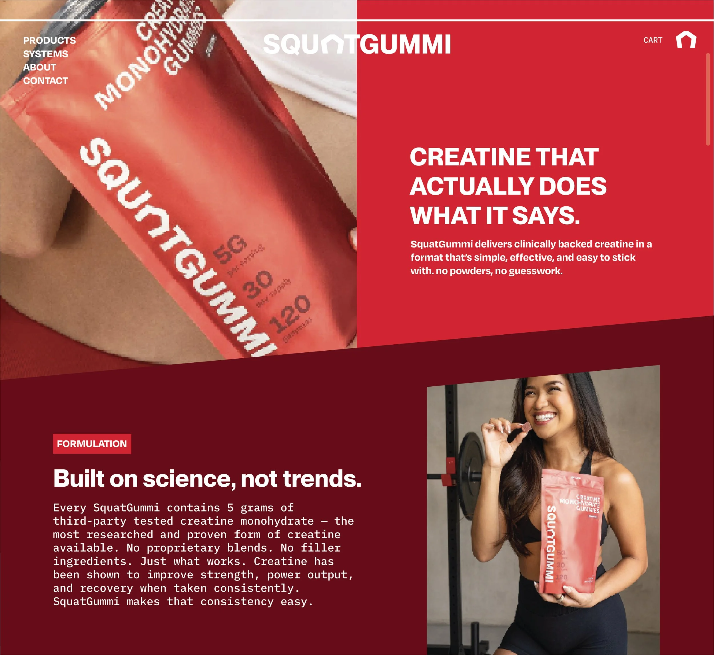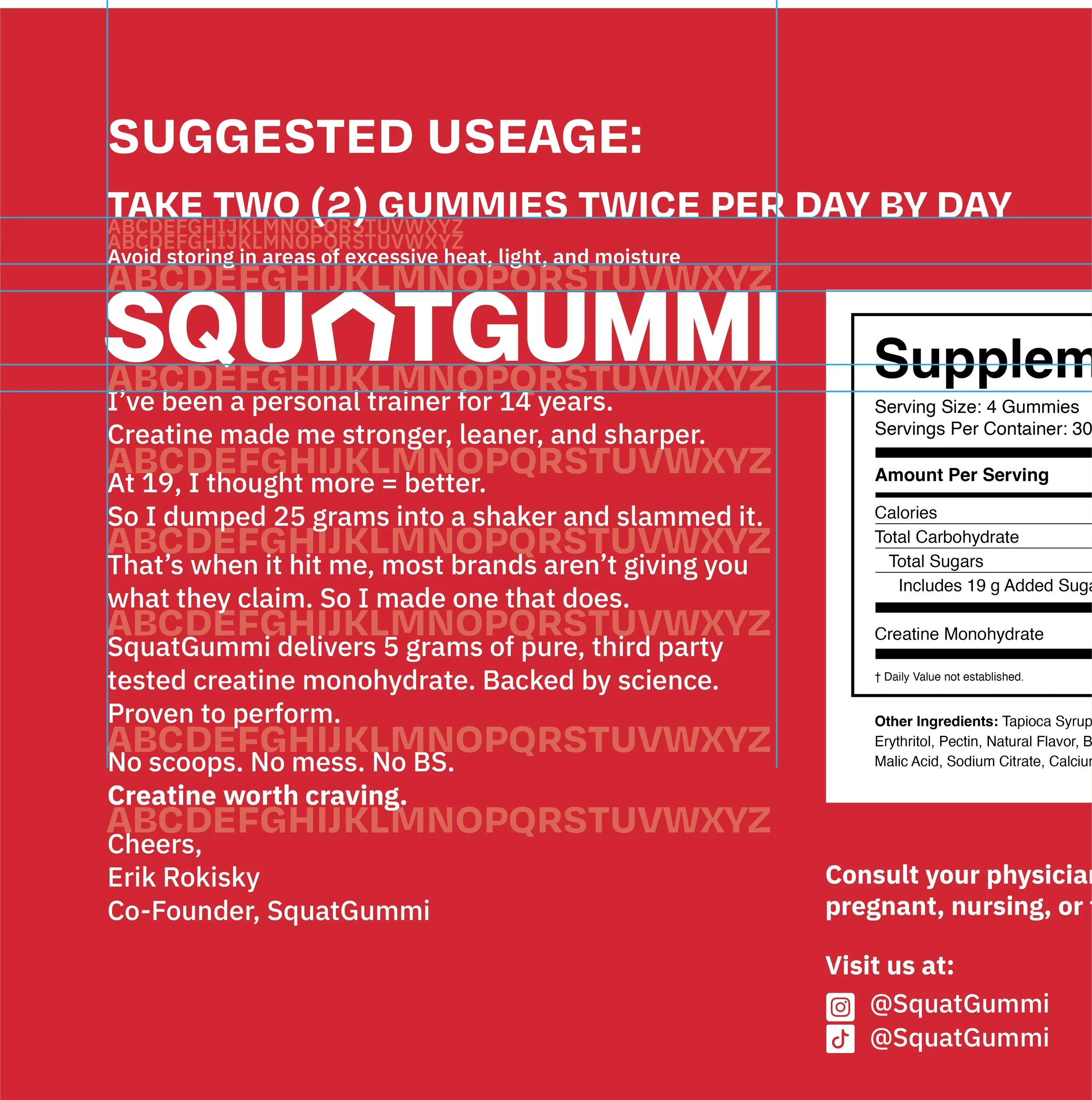SquatGummi typography was designed to reduce friction in a crowded supplement category by prioritizing clarity and approachability. Confident headlines are paired with highly legible supporting text to make functional information such as dosage, benefits, and usage easy to scan and understand. Type choices were intentionally neutral and modern, allowing the brand to feel credible and trustworthy without relying on aggressive fitness cues, and to perform consistently across packaging, digital, and marketing touchpoints.
